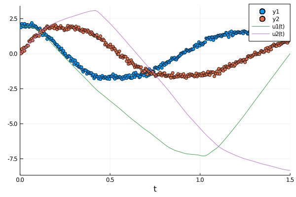 data = Array(solve(prob_trueode, Tsit5(), saveat = tsteps)) .+ 0.1randn(2,300)