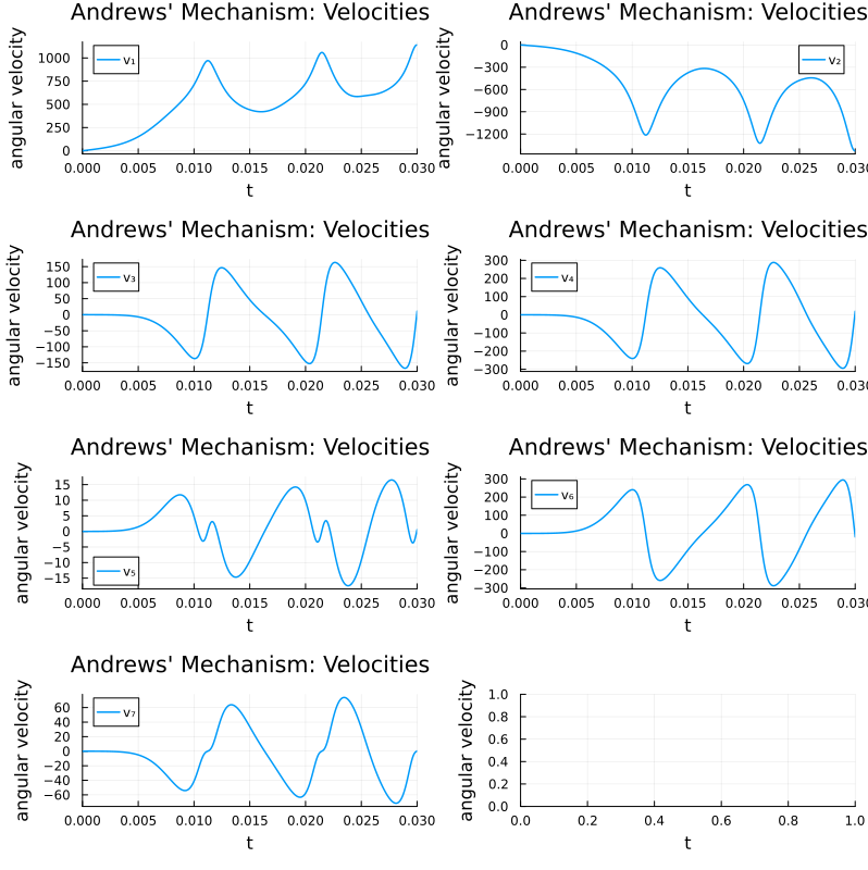 This is a benchmark of Andrews' squeezing mechanism, a classic index-3 DAE from the IVP Test Set (andrews.f). The system models the motion of 7 rigid bodies connected by joints without friction.