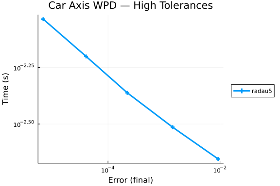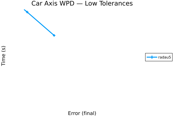 The Car Axis Problem is a stiff Differential-Algebraic Equation (DAE) of index 3, consisting of 8 differential and 2 algebraic equations. It models a rather simple multibody system: a car axis on a bumpy road.