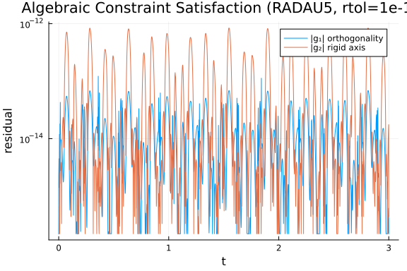 The implicit residual form $F(\dot{u}, u, t) = 0$ is the classic interface used by IDA, DASSL, and DASKR. This formulation preserves the full index-3 structure without any mass-matrix factoring.