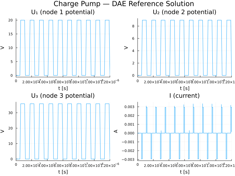 ModelingToolkit Index Reduction: This is an index-2 DAE. ModelingToolkit's Pantelides algorithm successfully reduces it to index-1, collapsing 9 unknowns to 4 (node potentials $U_2$, $U_3$ and their dummy derivatives). However, the index-reduced system introduces explicit derivatives of the piecewise charge functions $Q_G$, $Q_S$, $Q_D$, which have discontinuous first-order partial derivatives at the MOS operating-region boundaries. Standard implicit ODE solvers (Rodas5P, FBDF, etc.) fail on the reduced system because they cannot resolve the resulting non-smooth algebraic constraints. The MTK formulation is included below to demonstrate the structural analysis; the WPD benchmarks use the direct DAE residual form with IDA and DASKR.