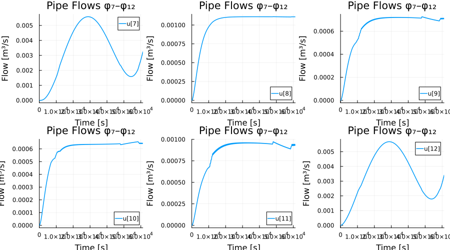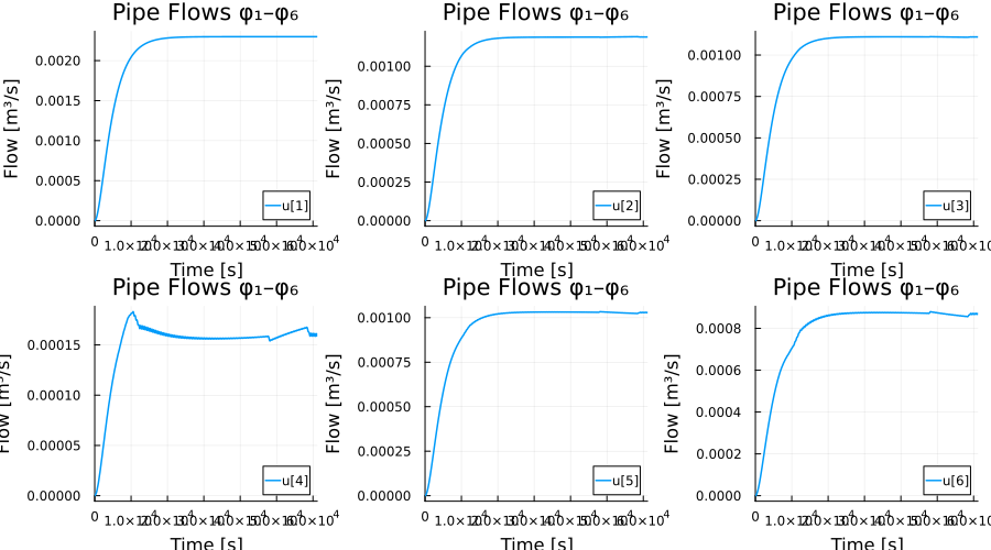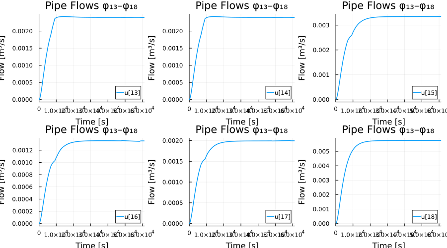 - 18 pipe flows: φᵢⱼ(t), volumetric flow rates [m³/s]
