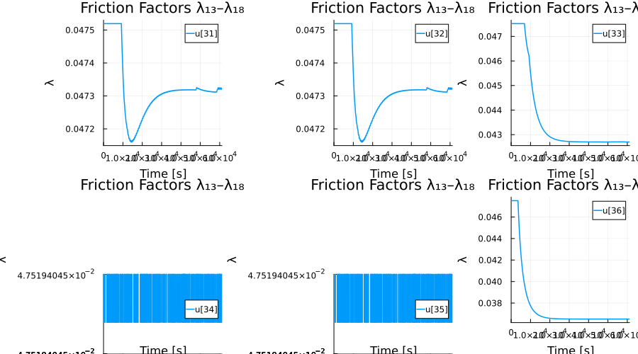 - Regime switching: Each pipe transitions between laminar (R ≤ 2300) and turbulent flow, with the turbulent Colebrook equation being implicit in λ.