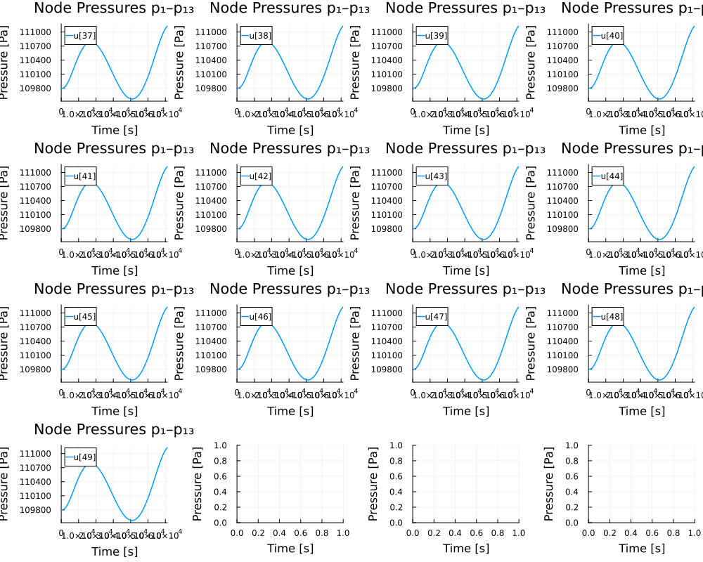 - Index-2 structure: Variables 1–38 are index-1, while the 11 non-buffer node pressures (variables 39–49) are index-2 algebraic constraints.