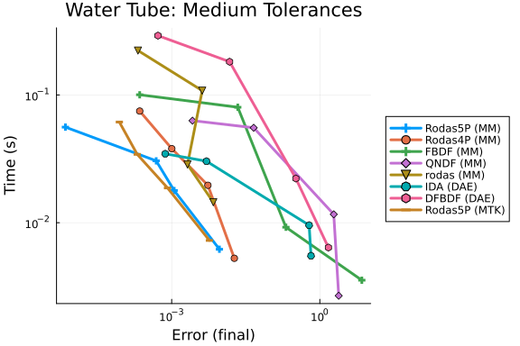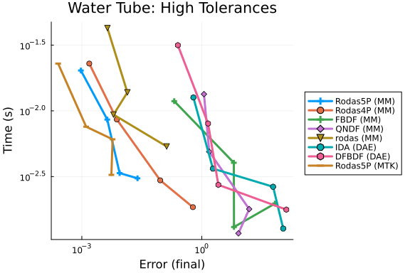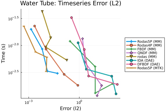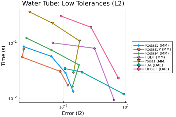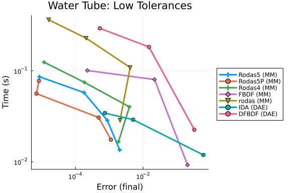 This is a benchmark of the Water Tube System, an index-2 DAE of dimension 49 from the IVP Test Set (Fekete 2006, water.F).