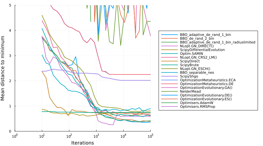 xlabel = "Iterations", ylabel = "Mean distance to minimum"