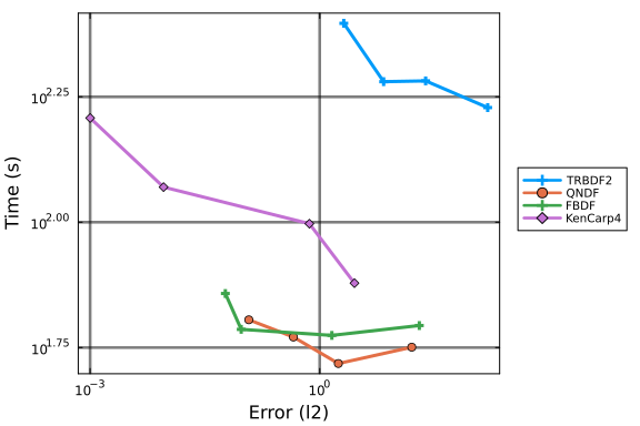 We also time the ODE rhs function with BenchmarkTools as it is more accurate given how fast evaluating f is:
