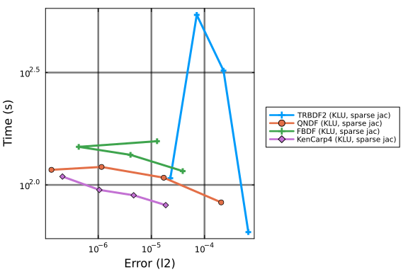 sparsejacprob.f(du, u, p, 0.0)We also time the ODE rhs function with BenchmarkTools as it is more accurate given how fast evaluating f is:
