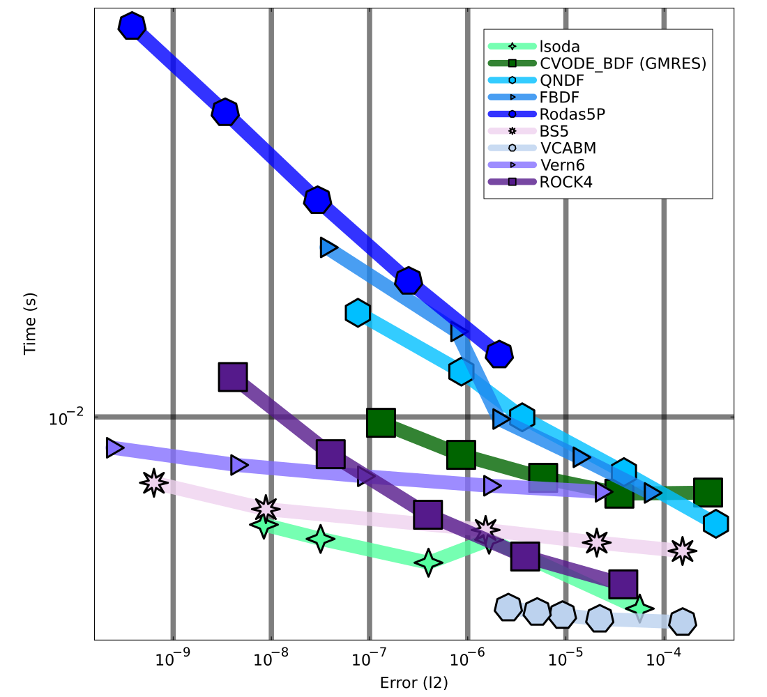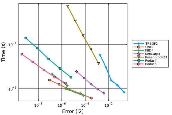 Finally, we generate a work-precision diagram for the selection of solvers.