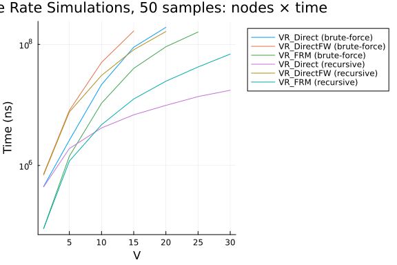 We benchmark the variable rate aggregators (VR_Direct, VR_DirectFW, VR_FRM) for the Multivariate Hawkes process, using the same setup as above: networks from 1 to 50 nodes, tspan=(0.0, 25.0), \lambda=0.5, \alpha=0.1, \beta=5.0, and 50 trajectories with a 10-second limit per configuration. We test both recursive and brute-force formulations.