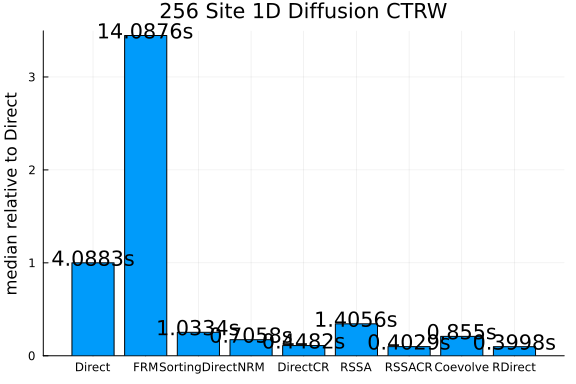 Here we implement a 1D continuous time random walk approximation of diffusion for $N$ lattice sites on $\left[0,1\right]$, with reflecting boundary conditions at $x=0$ and $x=1$. Note that our goal is to benchmark the non-spatial well-mixed stochastic simulation algorithms (SSAs), so we do not benchmark the spatial SSAs too here.