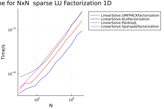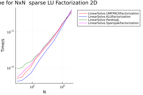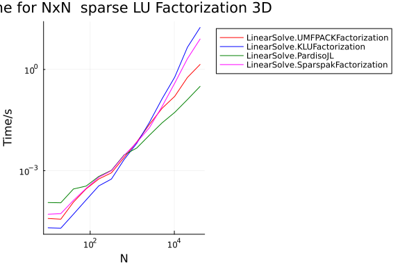 title = "Time for NxN sparse LU Factorization $(dim)D",