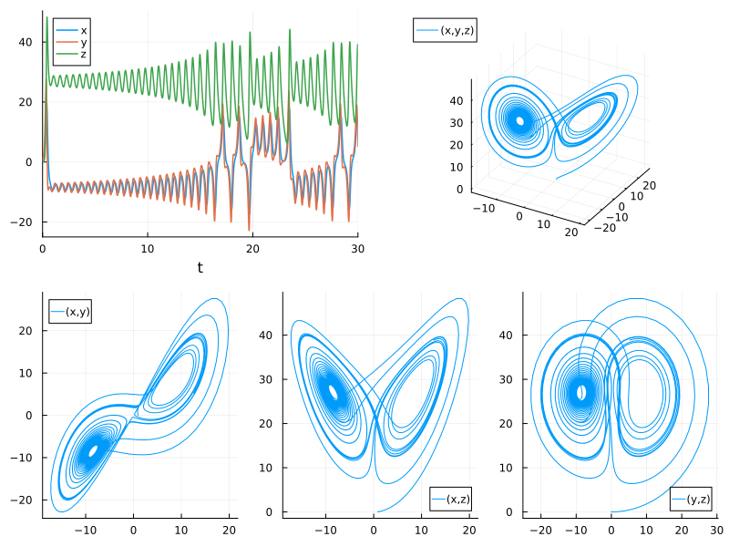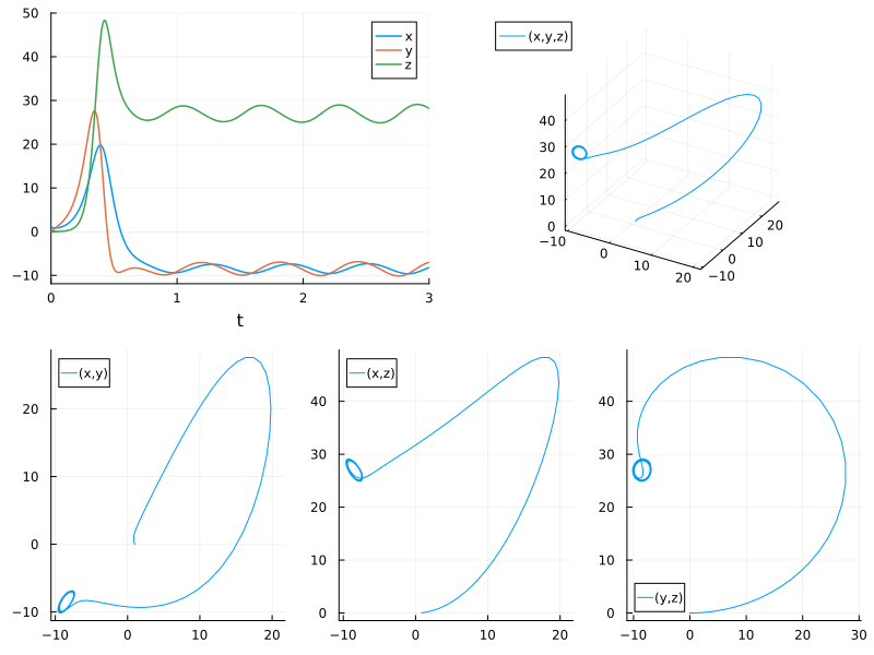 plot(plot(xyzt,xyz),plot(xy, xz, yz, layout=(1,3),w=1), layout=(2,1), size=(800,600))