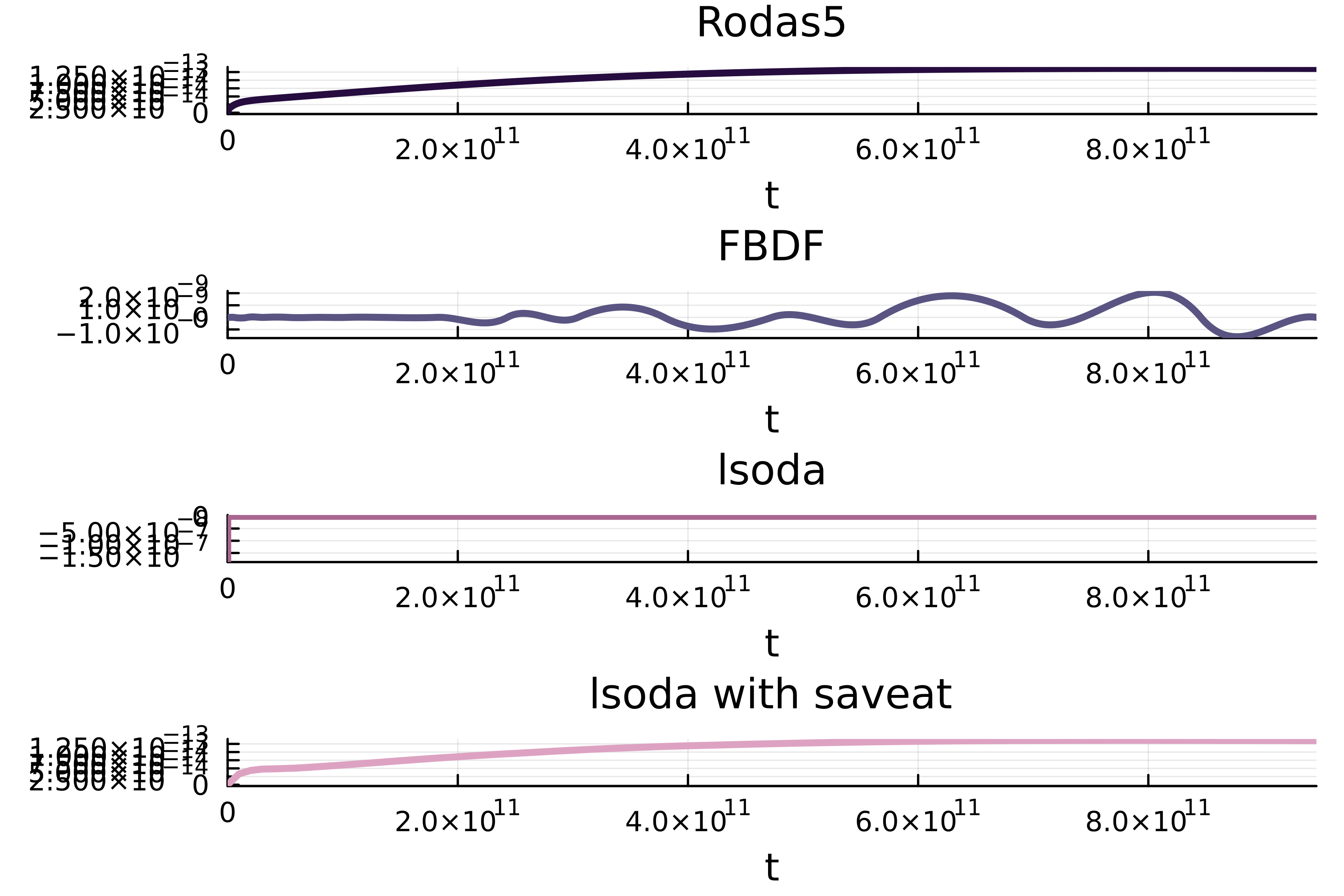 p4 = plot(sol4, vars = (0,11), lc=colors[4], legend = false, titlefontsize = 12, lw = 3, title = "lsoda with saveat")