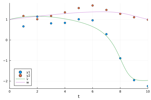 data = convert(Array, VectorOfArray([(sol(t[i]) + sig*randn(2)) for i in 1:length(t)]))2×10 Matrix{Float64}: