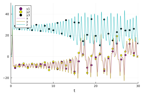 data = convert(Array, VectorOfArray([(sol(t[i]) + sig*randn(3)) for i in 1:length(t)]))3×30 Matrix{Float64}: