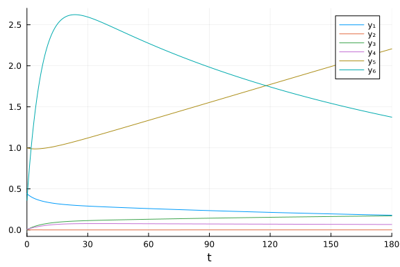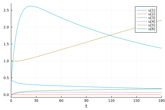 mmprob = ODEProblem(mmf, [0.444,0.00123,0.0,0.007,1.0,115.83*0.444*0.007], tspan)