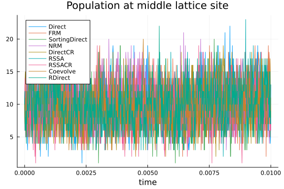 plot!(ploth, title="Population at middle lattice site", xlabel="time")Benchmarking method: JumpProcesses.Direct()