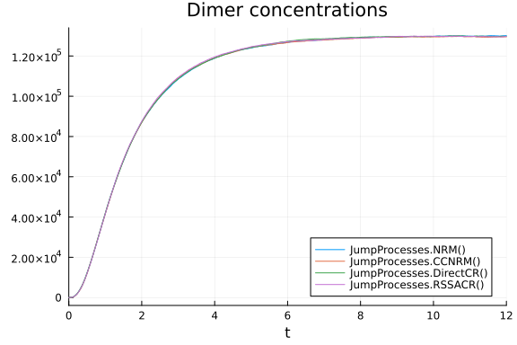 Let's first look at how the model equilibriates to make sure we get consistent results for all the methods. Let's plot the dimer concentration as a function of time using each of the different stochastic simulation algorithms.