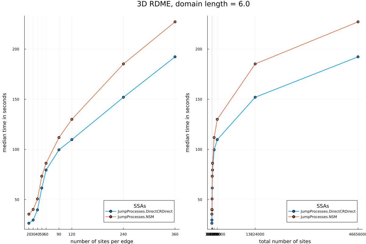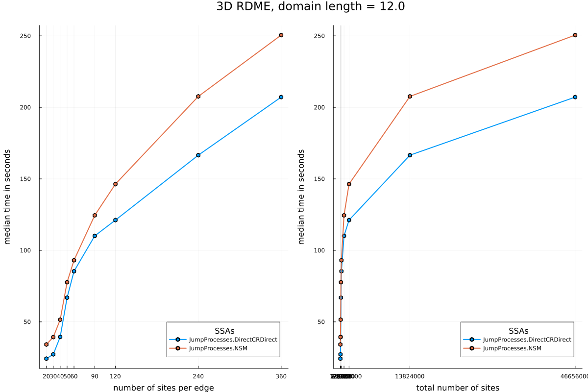Here we implement the model from [1] (8 species and 12 reactions) for different mesh sizes, and benchmark the performance of JumpProcesses.jl's spatial stochastic simulation alorithms (SSAs). Below, the value N will denote the number of subvolumes along one dimension of a cubic grid, representing the reaction volume. In [1] this value ranges from 20 to 60.