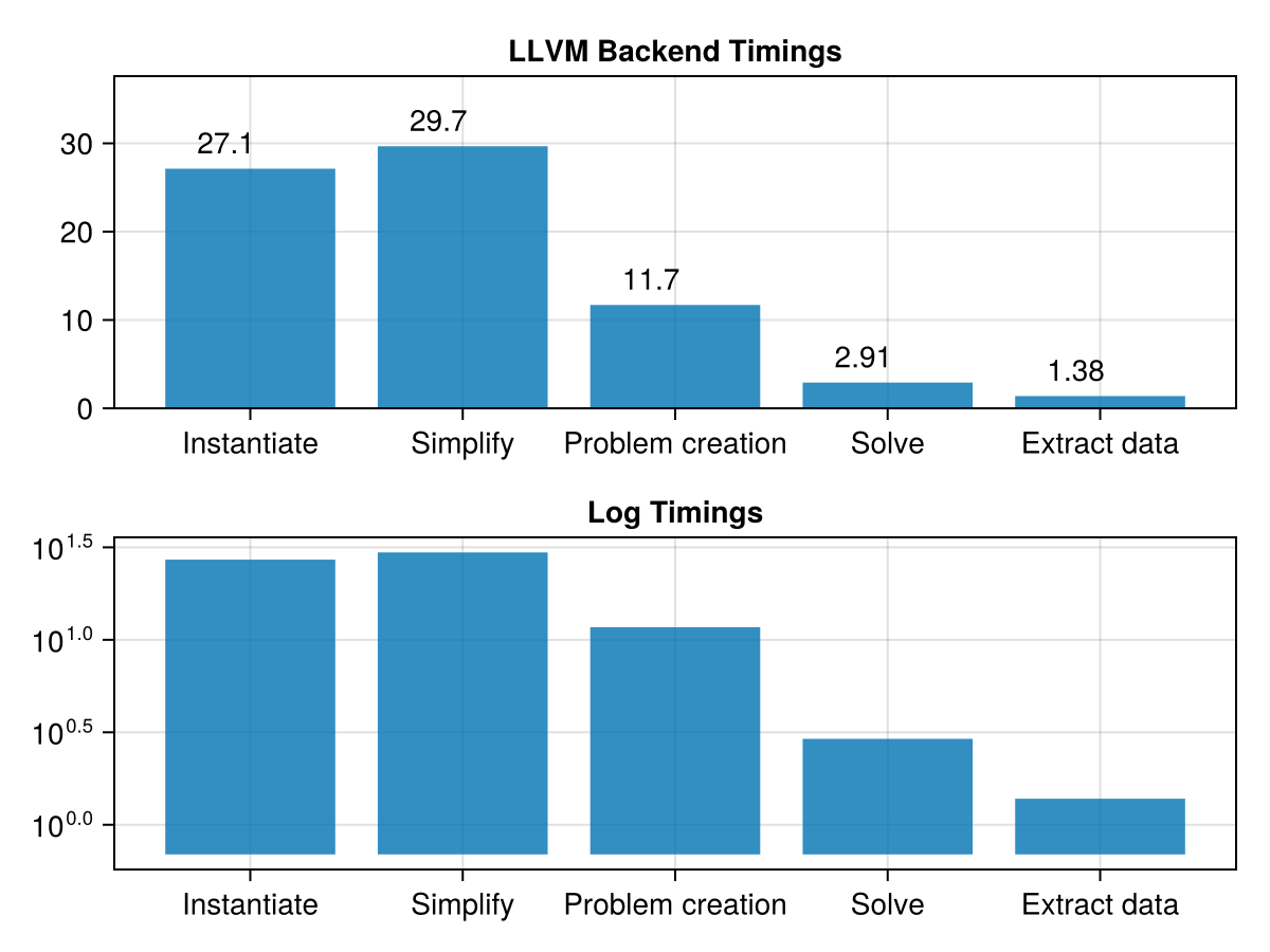 barplot(f[2,1], llvm_timings, axis=(; title="Log Timings", xticks = (xs, labels), yscale=log10))