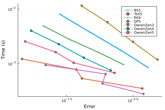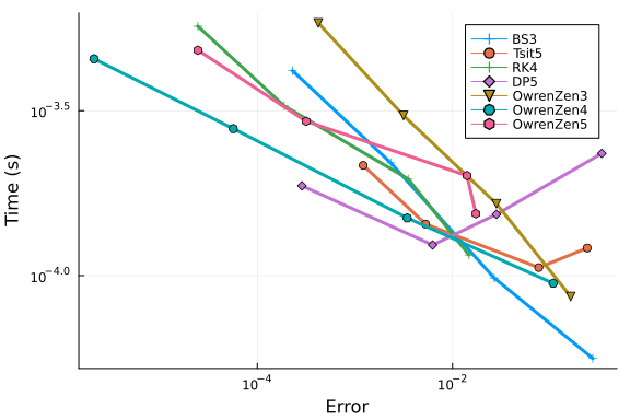 Apparently Tsit5 and DP5 perform quite well at low tolerances, but only OwrenZen5, OwrenZen4 and RK4 achieve interpolation errors of around 1e-9.