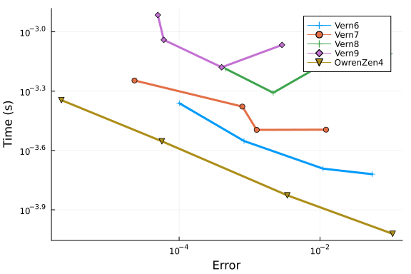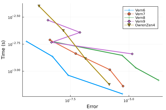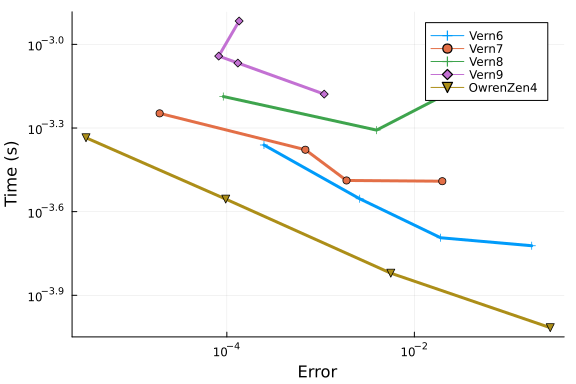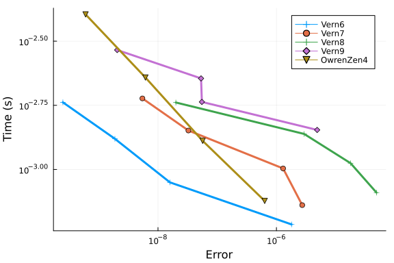 Vern6, Vern7, and Vern9 show similar results at low tolerances, and perform even better than OwrenZen4.