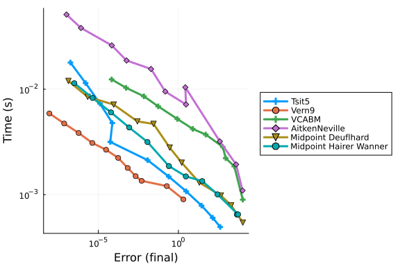 solnames = ["Tsit5","Vern9","VCABM","AitkenNeville","Midpoint Deuflhard","Midpoint Hairer Wanner"]