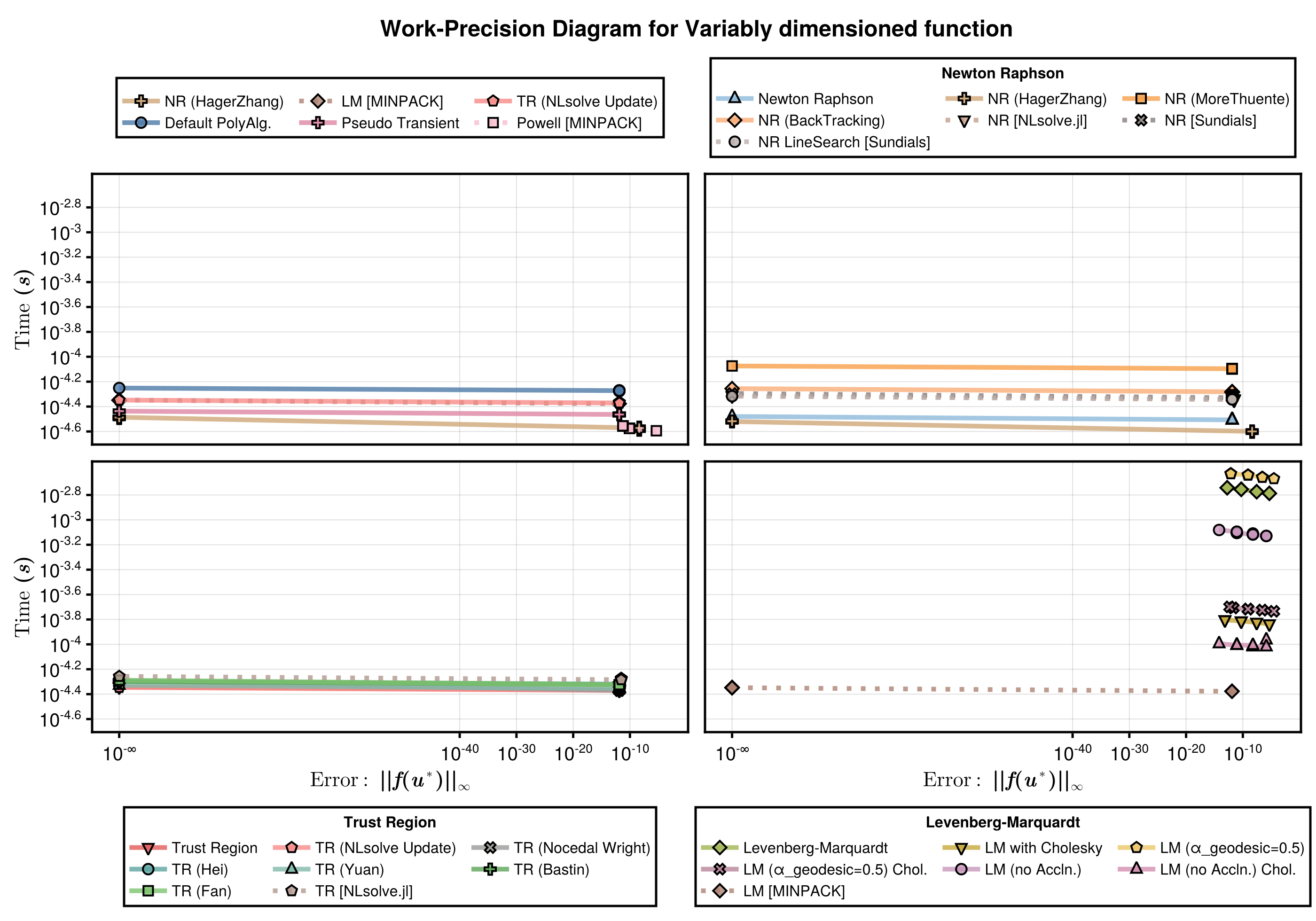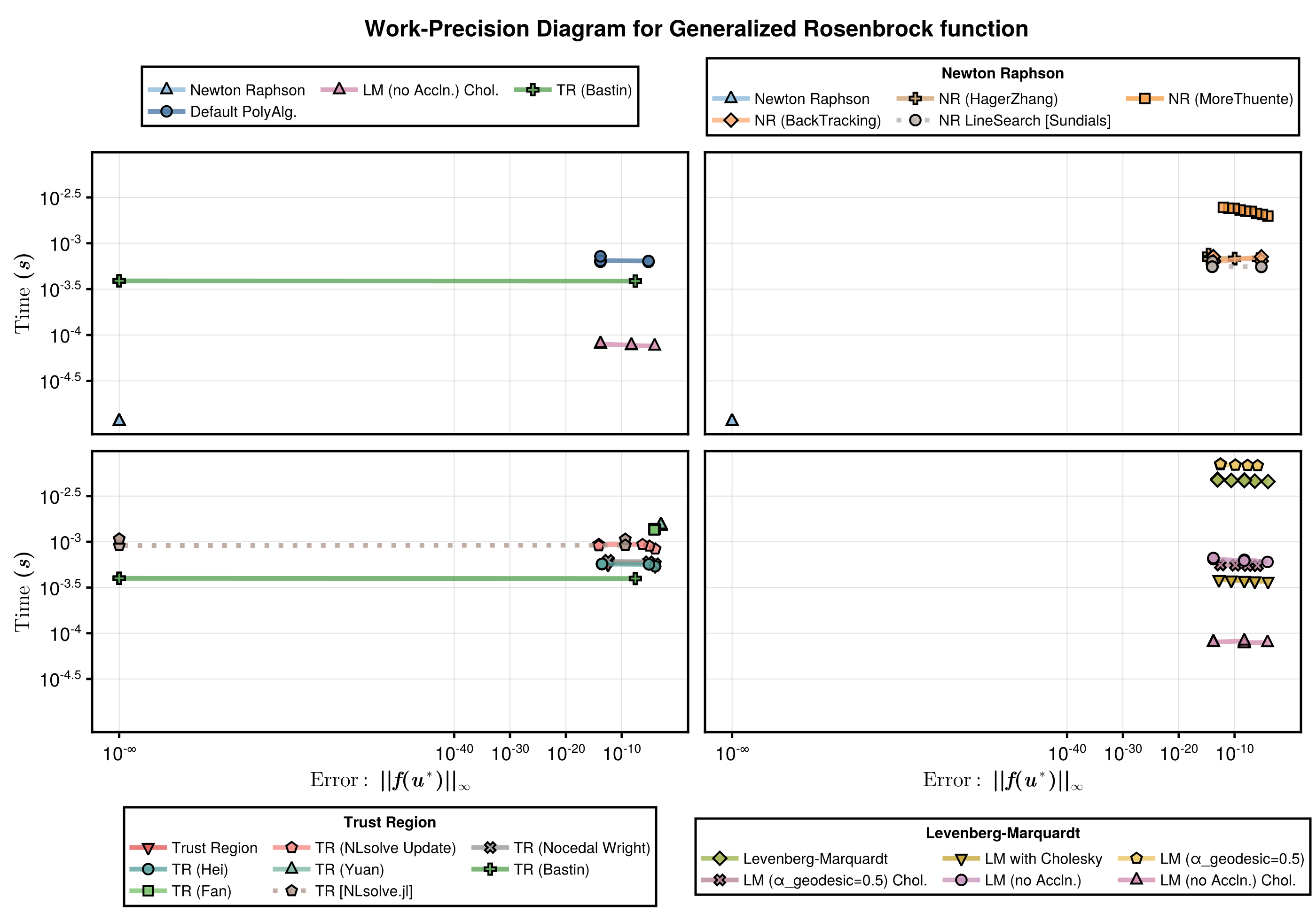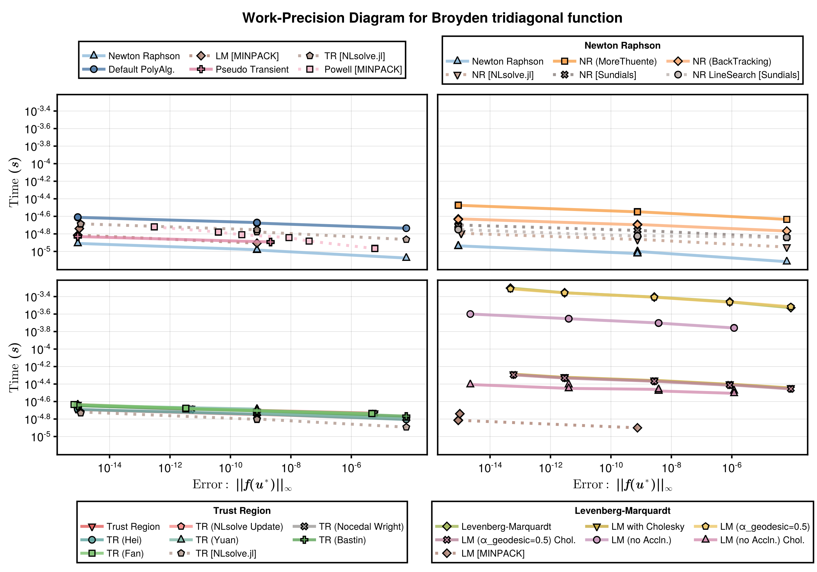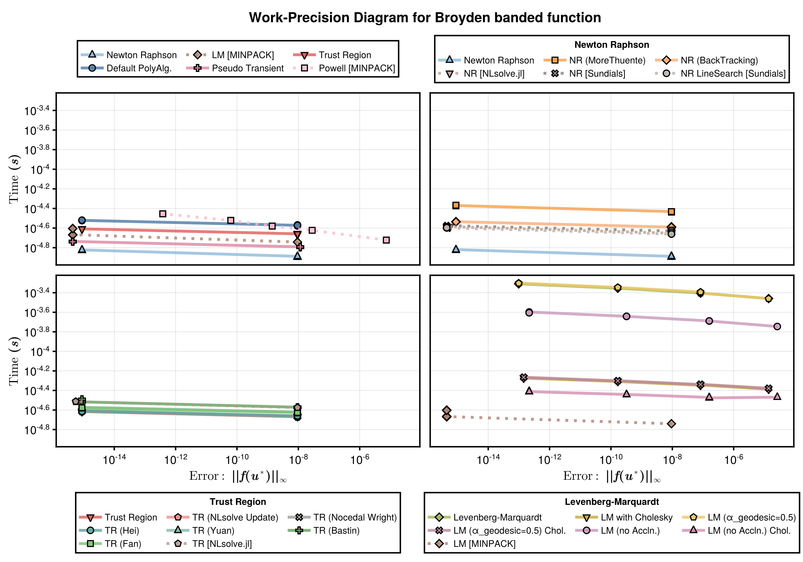 BenchmarkTools, LinearAlgebra, DiffEqDevTools, NonlinearProblemLibrary, CairoMakie,