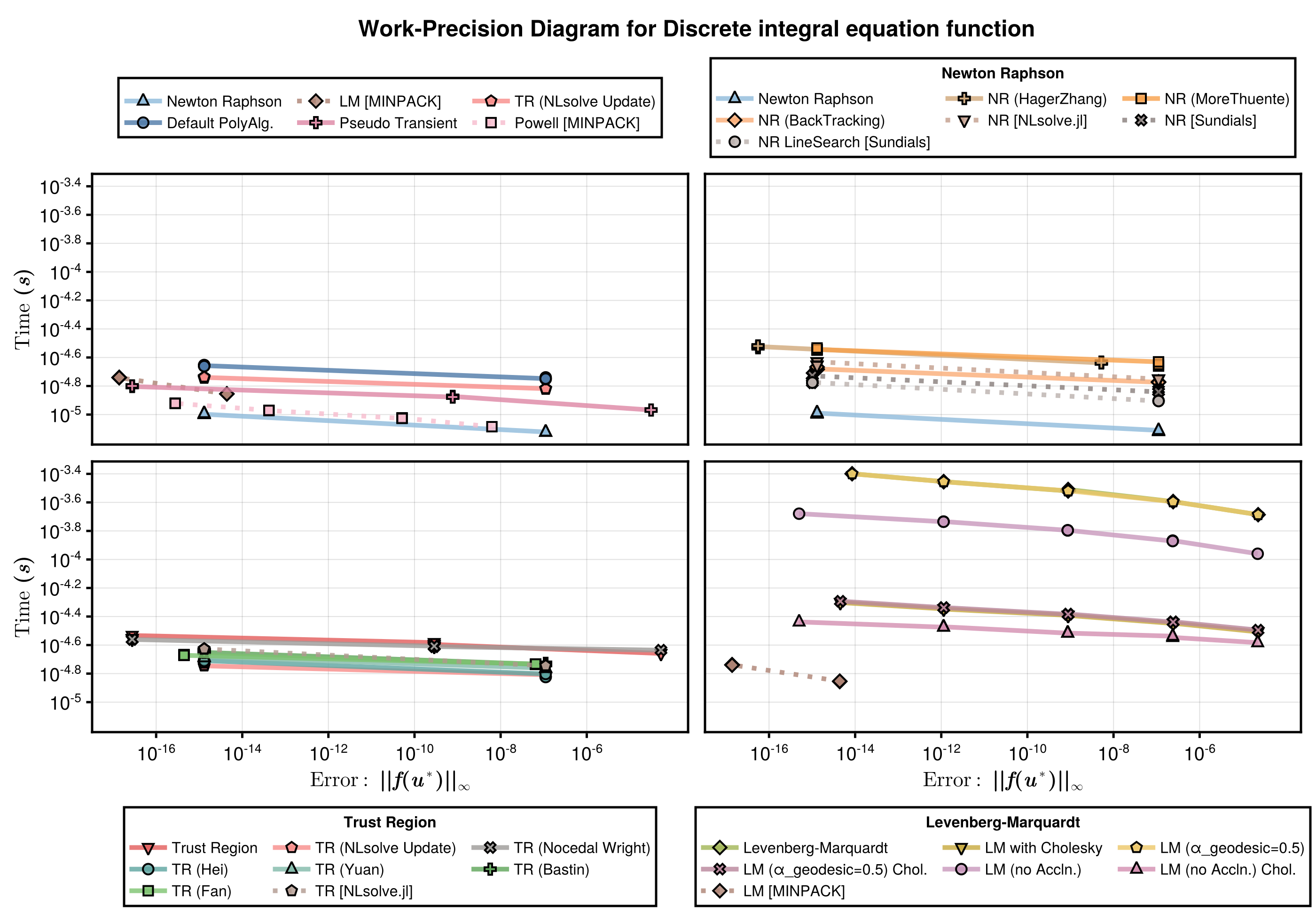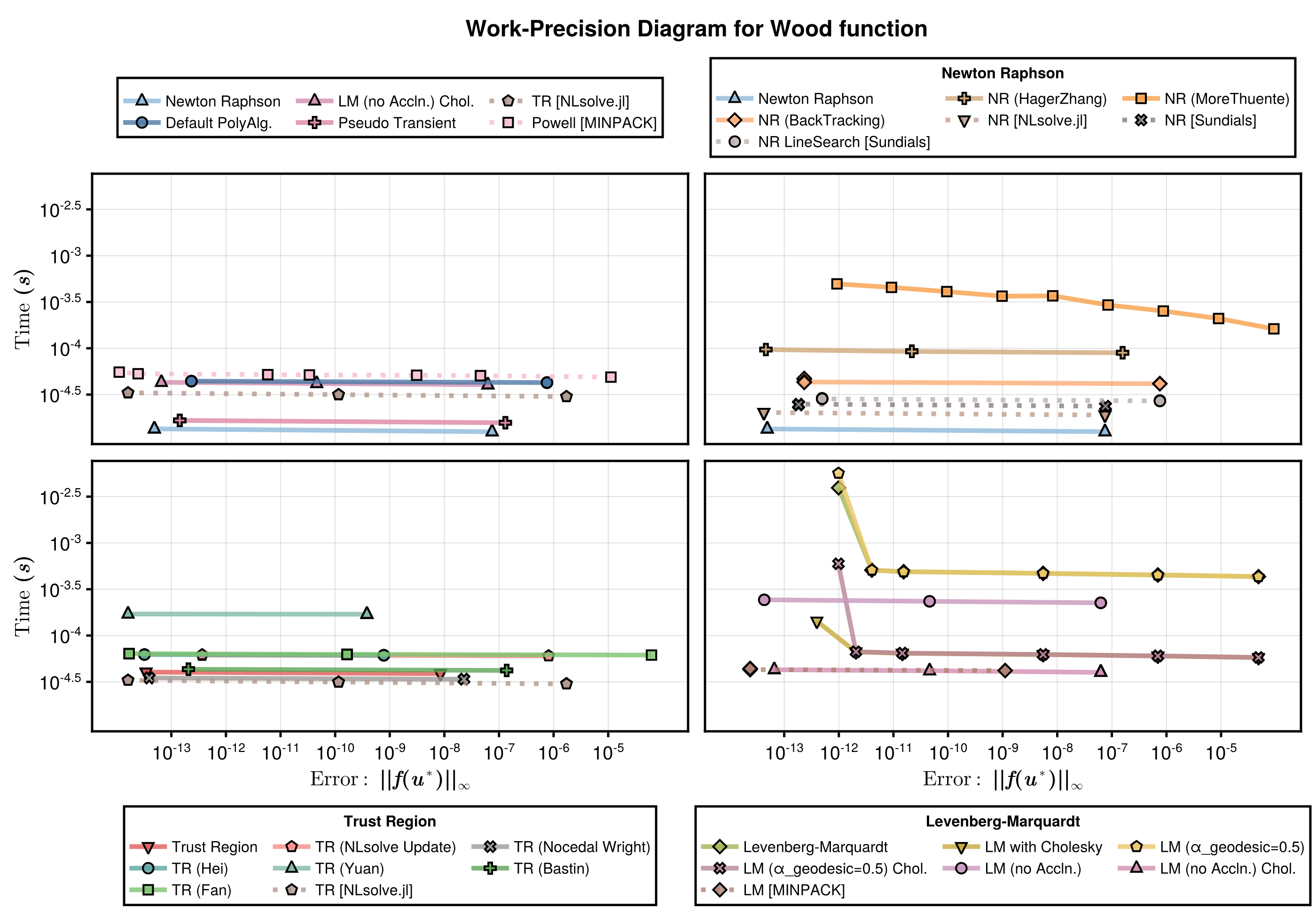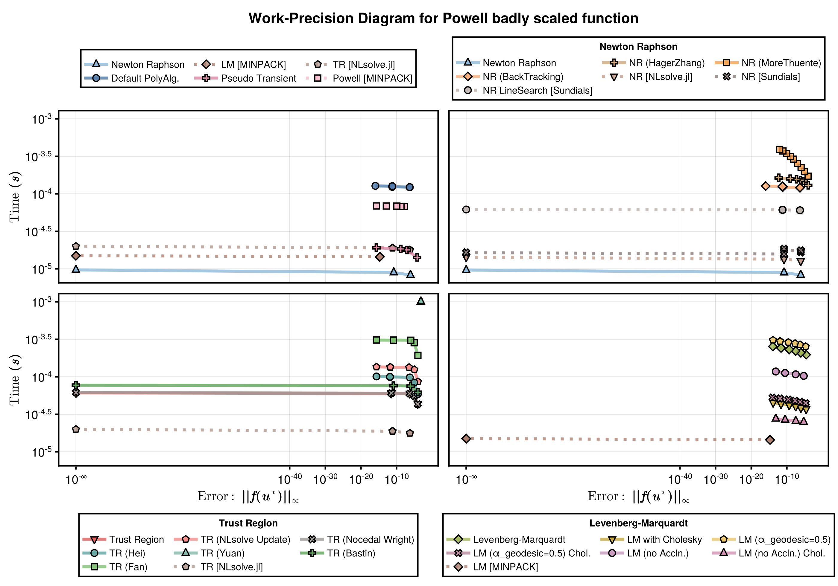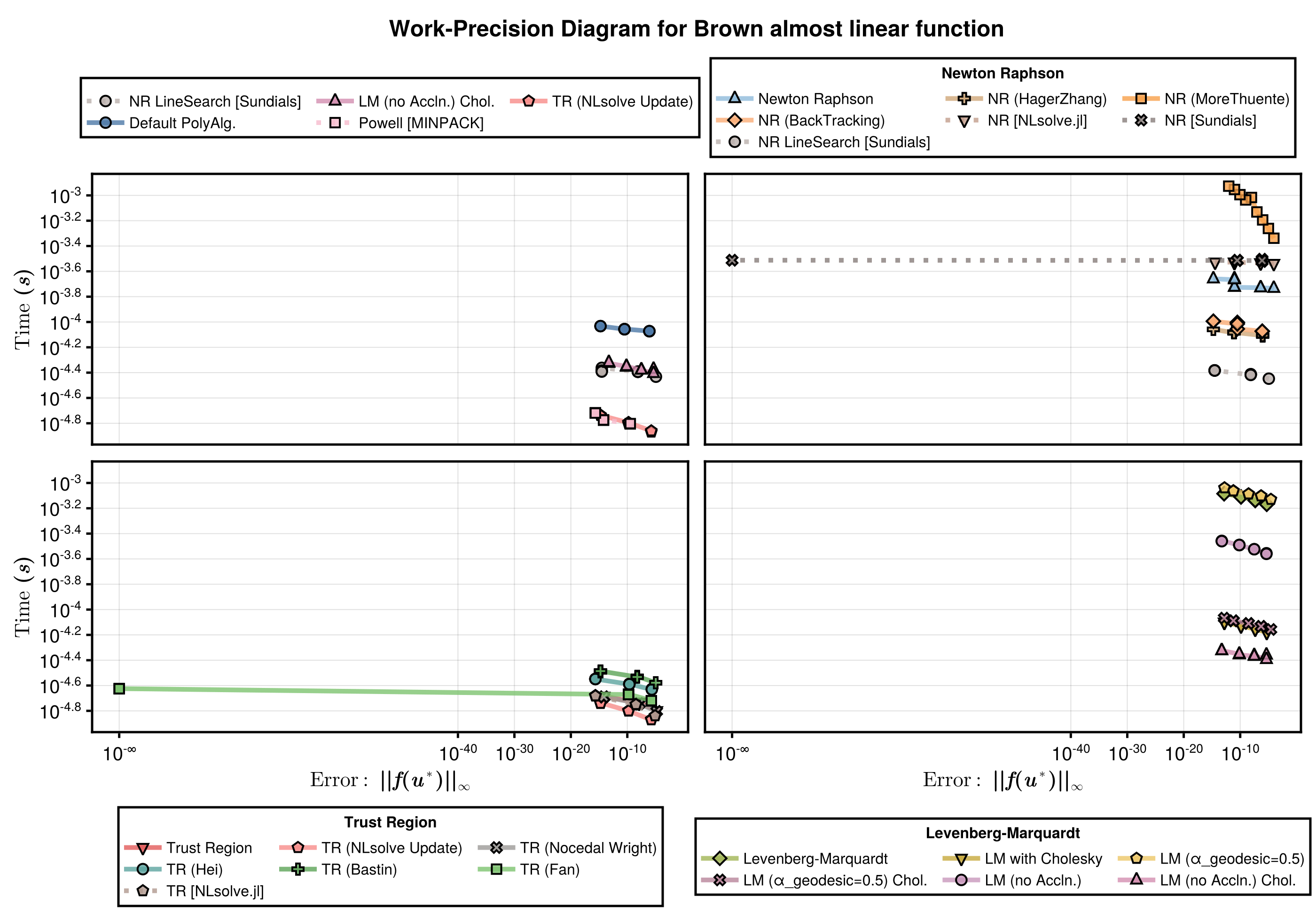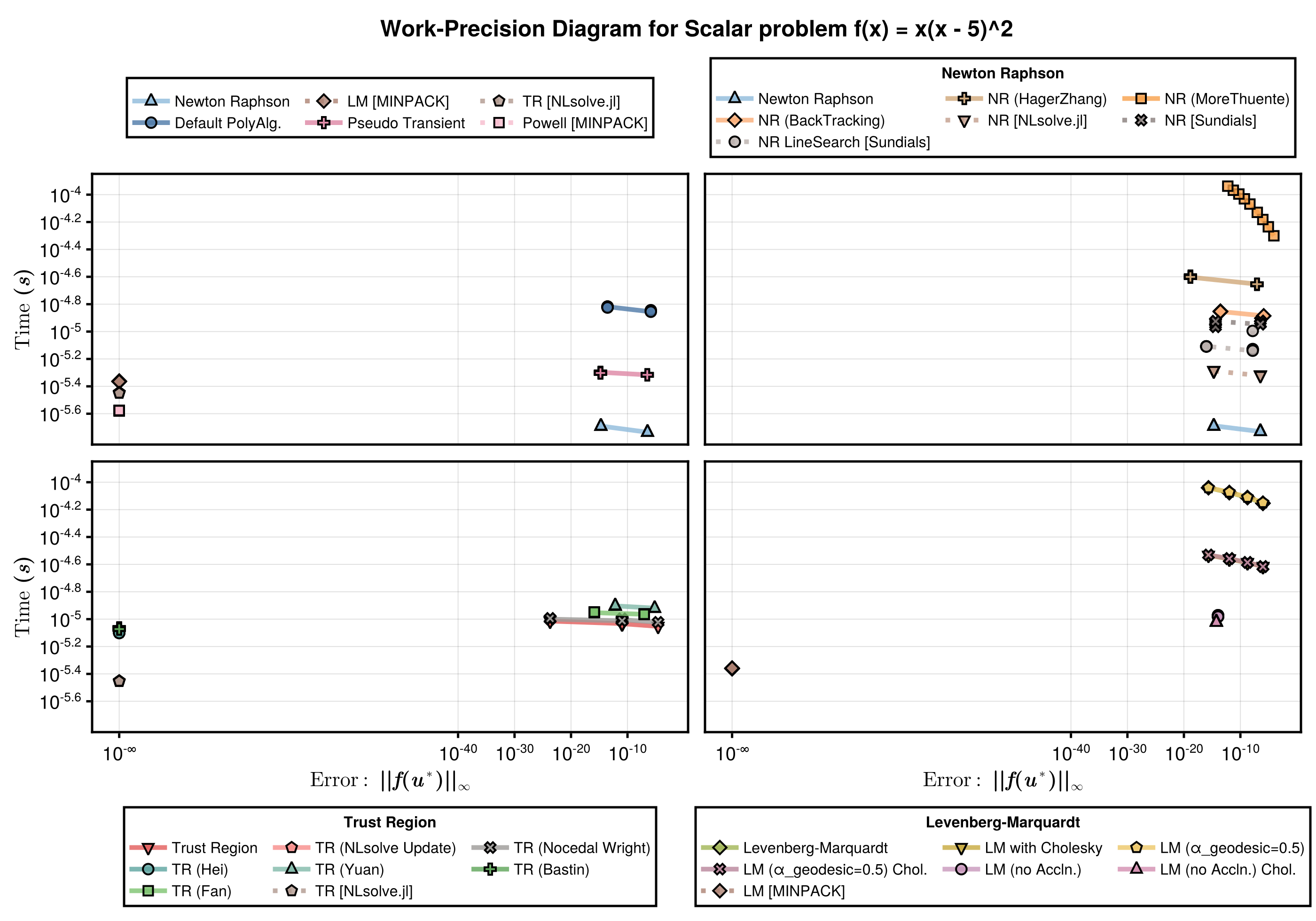 BenchmarkTools, LinearAlgebra, DiffEqDevTools, NonlinearProblemLibrary, CairoMakie,