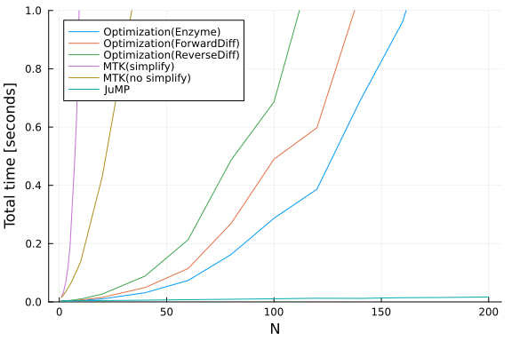 labels = ["Optimization(Enzyme)" "Optimization(ForwardDiff)" "Optimization(ReverseDiff)" "MTK(simplify)" "MTK(no simplify)" "JuMP"],