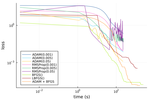p = plot([times_1, times_2, times_3, times_4, times_5, times_6, times_7, times_8, times_9], [loss_1, loss_2, loss_3, loss_4, loss_5, loss_6, loss_7, loss_8, loss_9],xlabel="time (s)", ylabel="loss", xscale=:log10, yscale=:log10, labels=["ADAM(0.001)" "ADAM(0.005)" "ADAM(0.05)" "RMSProp(0.001)" "RMSProp(0.005)" "RMSProp(0.05)" "BFGS()" "LBFGS()" "ADAM + BFGS"], legend=:bottomleft, linecolor=["#2660A4" "#4CD0F4" "#FEC32F" "#F763CD" "#44BD79" "#831894" "#A6ED18" "#980000" "#FF912B"])
