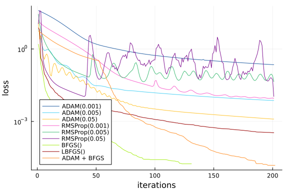 p = plot([loss_1, loss_2, loss_3, loss_4, loss_5, loss_6, loss_7, loss_8, loss_9], xlabel="iterations", ylabel="loss", yscale=:log10, labels=["ADAM(0.001)" "ADAM(0.005)" "ADAM(0.05)" "RMSProp(0.001)" "RMSProp(0.005)" "RMSProp(0.05)" "BFGS()" "LBFGS()" "ADAM + BFGS"], legend=:bottomleft, linecolor=["#2660A4" "#4CD0F4" "#FEC32F" "#F763CD" "#44BD79" "#831894" "#A6ED18" "#980000" "#FF912B"])