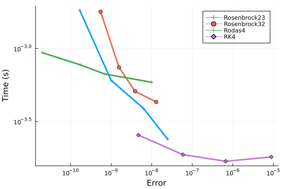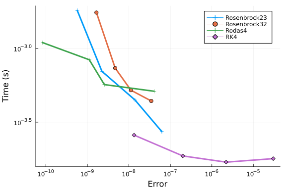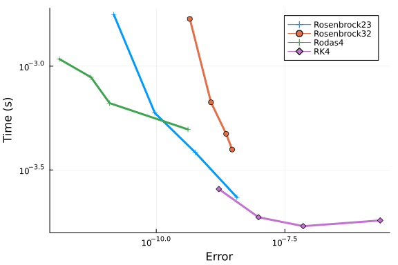We repeat these tests with Rosenbrock methods, and include RK4 as reference.