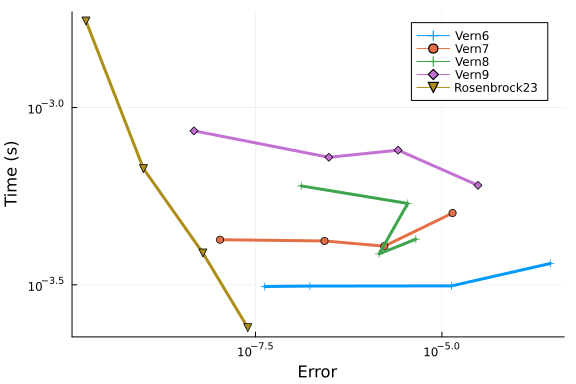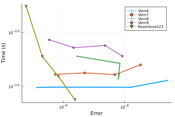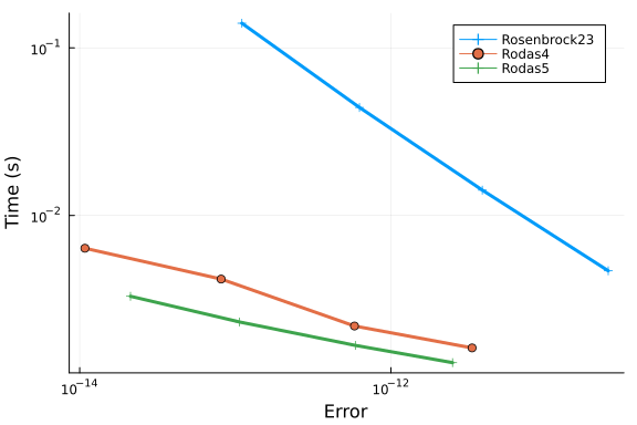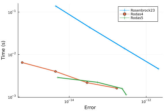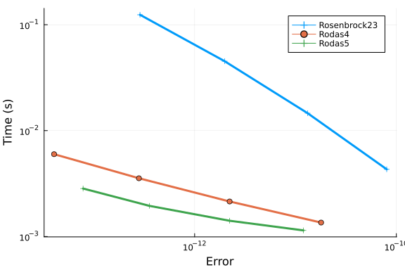 We repeat our tests of Rosenbrock methods Rosenbrock23 and Rodas5 at low tolerances: