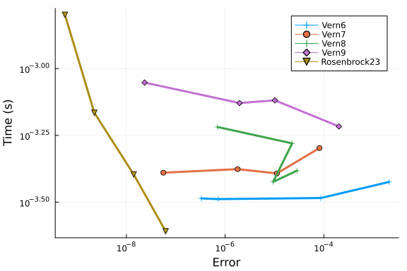 Finally we test the Verner methods with lazy interpolants, and include Rosenbrock23 as reference.